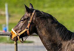 Hongre demi-sang Suisse issu de notre propre élevage, encore vert, élevé en pâturage avec d'autres poulains et en groupe à la ferme.